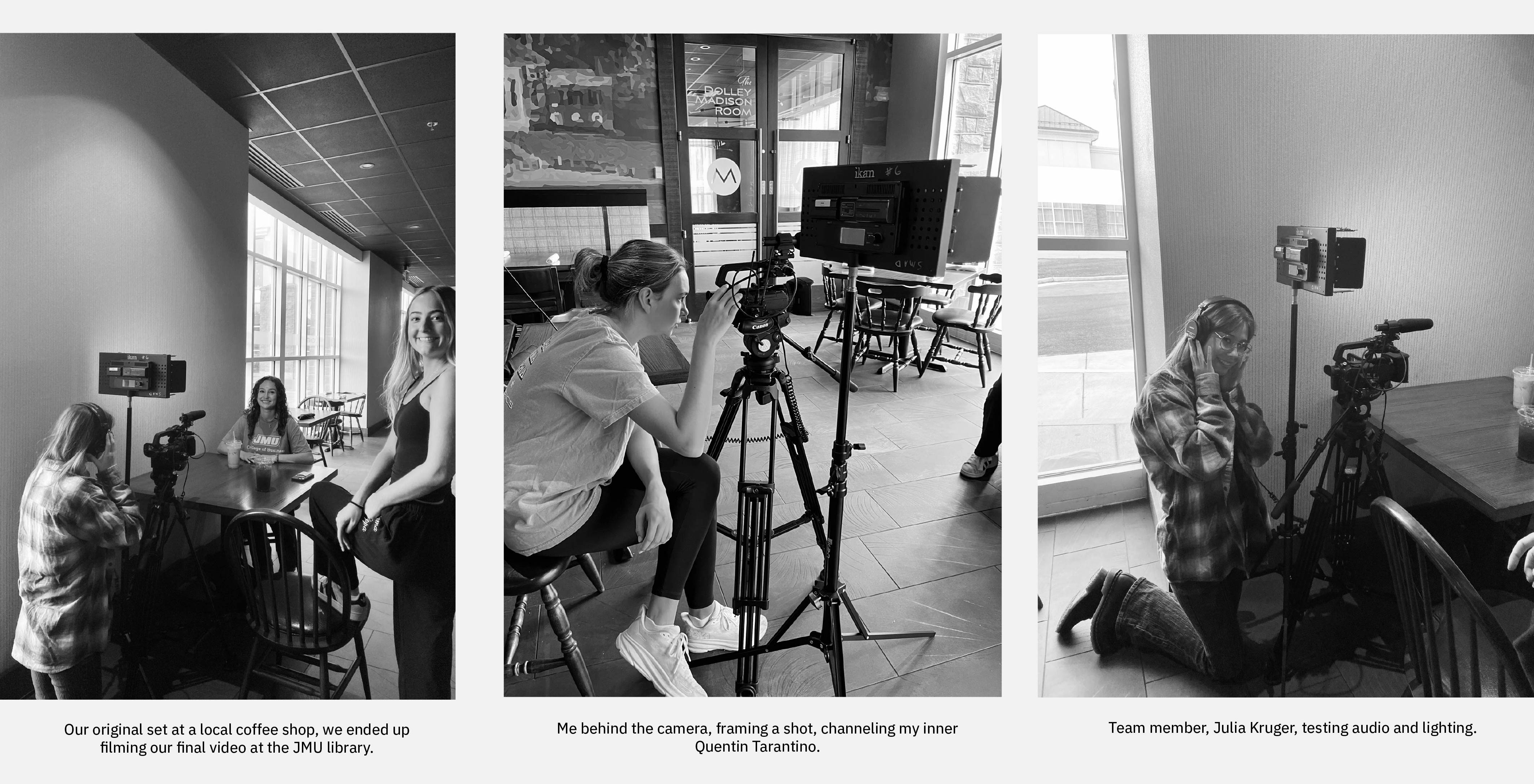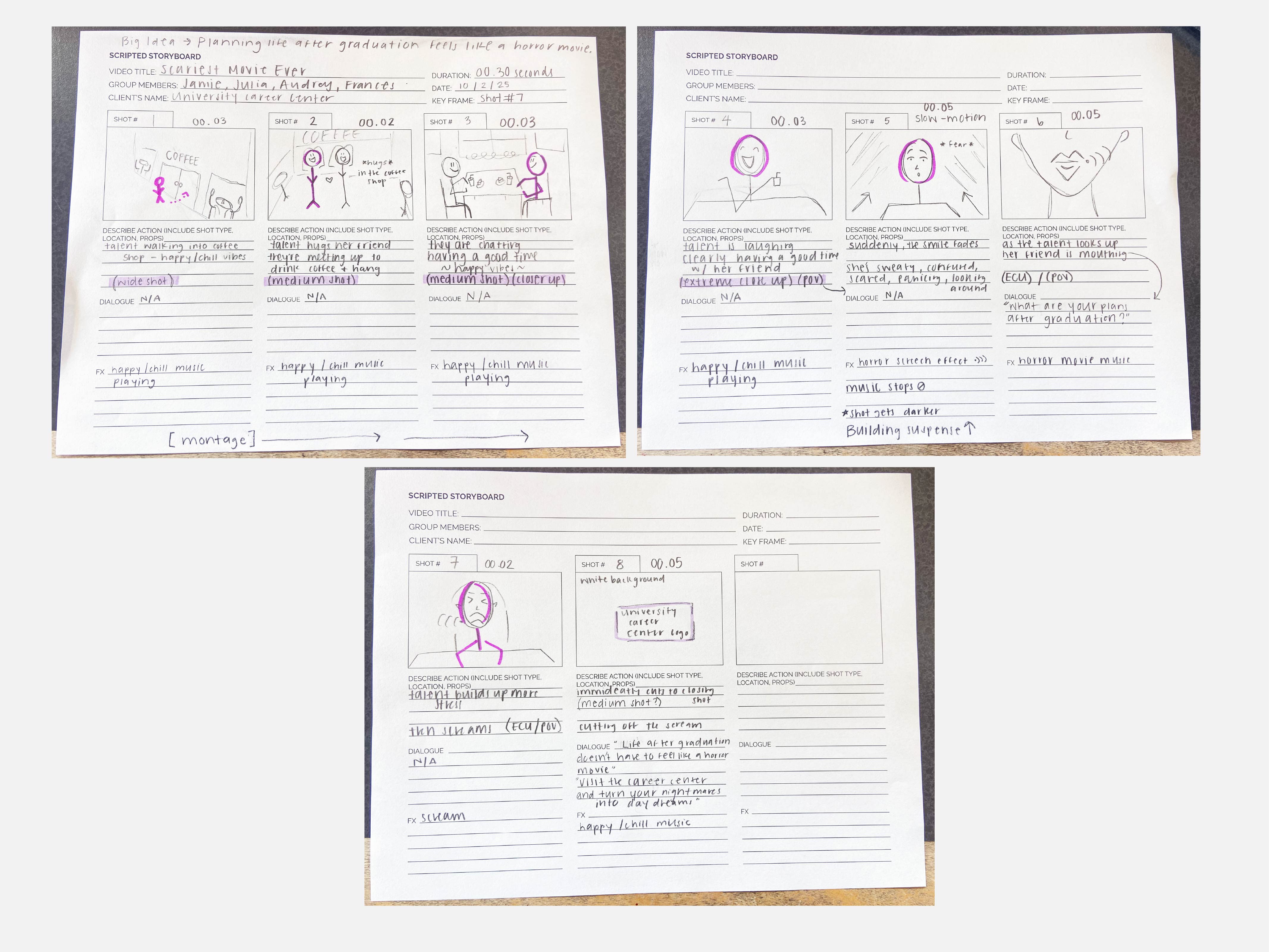 Our research was diverse. We pulled statistics from scholary articles and insights from in-person interviews with seniors at our school. Using our research findings, audience analysis, objectives, and goals, we brainstormed. Ok so seniors at our school are stressed and anxious about life after graduation, our university has a career center that helps students plan for life after graduation. Boom, our big idea was born: Planning life after graduation at the University Career Center will not be scary. Being that it was Halloween season, we honed in a horror theme and exaggerated it. Inspired by classic horror movie tropes, like dolly shots, and extreme close up slow mo's we created our sketches and then moved into production.