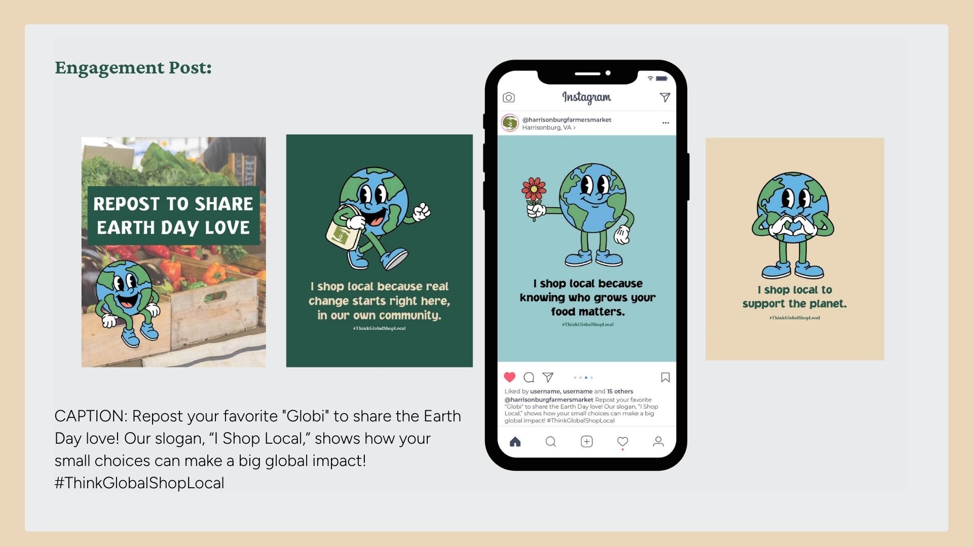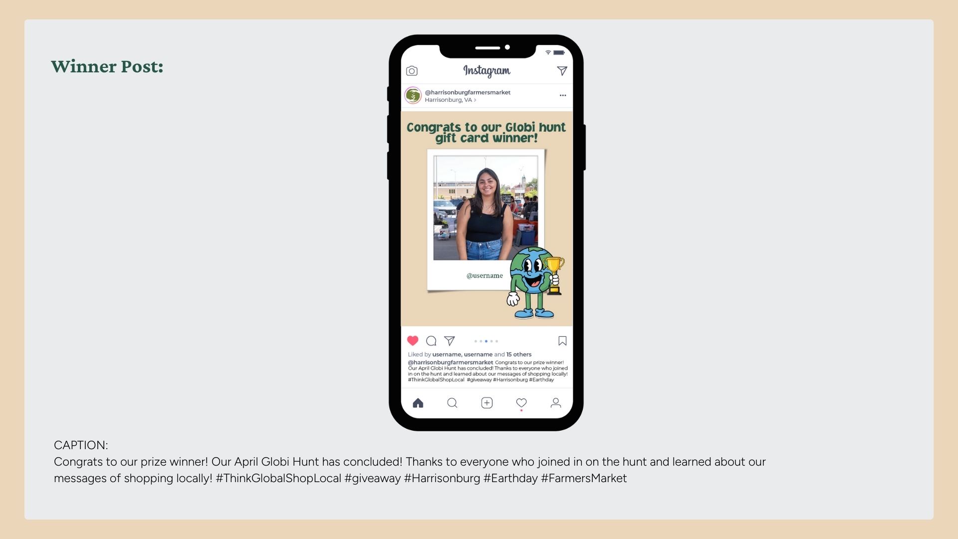 For my SMAD 342 course (Elements of Creative Advertising) my team and I partnered with the local farmers market to boost their in-person traffic and online engagement. We created a month-long campaign for April, centered around Earth Day, and knew we needed something interactive that would pull people in. After tossing around a ton of ideas, we landed on a scavenger hunt. It's fun for kids, easy for parents, and perfect for social media. Our main audience was millennial women ages 30–40, and we kept in mind that their kids would probably be the ones dragging them around on the hunt.